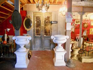 Saint-andré-village-antiquaires-entrée-avec-panneau-musée-et-deux-lions