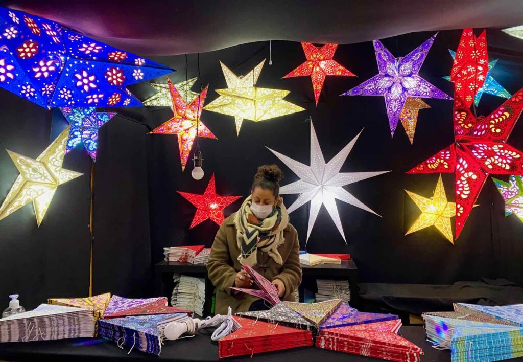 On les voit de loin et elles illuminent la nuit lilloise. Les étoiles de Diwali Stars, pour la première fois au marché de Noël de Lille, peuvent faire une chouette veilleuse pour une chambre d’enfant ou une belle déco de saison. Papier cartonné, doublé de papier de soie, elles sont aussi légères que poétiques… J’aime beaucoup !