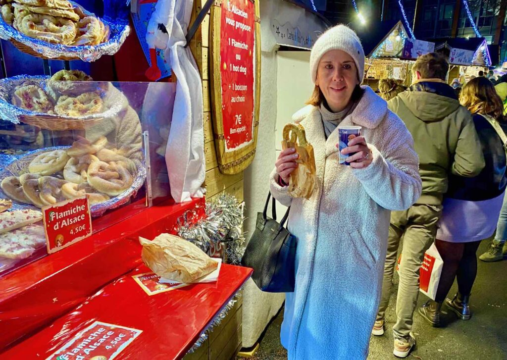 Bon OK, c’est beaucoup moins luxueux. N’empêche, le stand de vin chaud et autres spécialités alsaciennes est mon must à moi. Forcément, je suis née là-bas… Alors, même si je ne demande pas une rasade de mirabelle, framboise ou poire williams dans mon gobelet, c’est toujours sur ce stand, dont le patron est un Strasbourgeois pur sucre, que je vais boire mon vin chaud (3 €). En général avec un bretzel croustillant. Chassez le naturel…