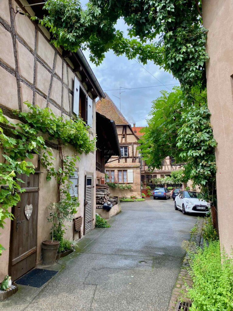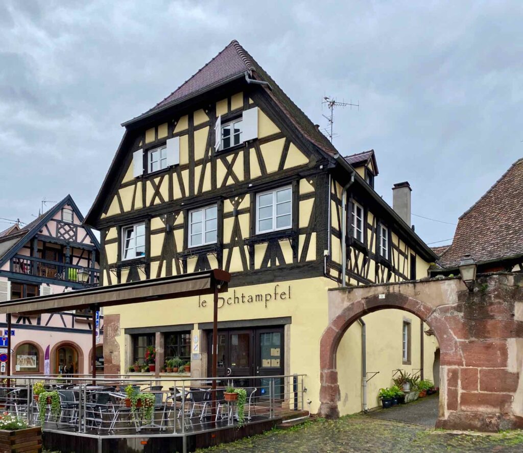 Ce jour-là, à l’heure du midi, Dame pluie et parapluies étaient de sortie. Presqu’une aubaine pour qui veut savourer le plaisir d’entrer dans un resto typique et goûter à la « gemütlichkeit » alsacienne, ce mot bizarre qui signifie à la fois chaleureux, douillet, cosy… ou les trois à la fois !