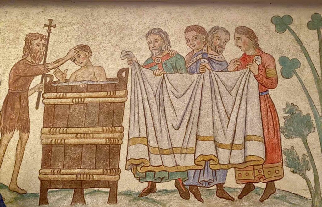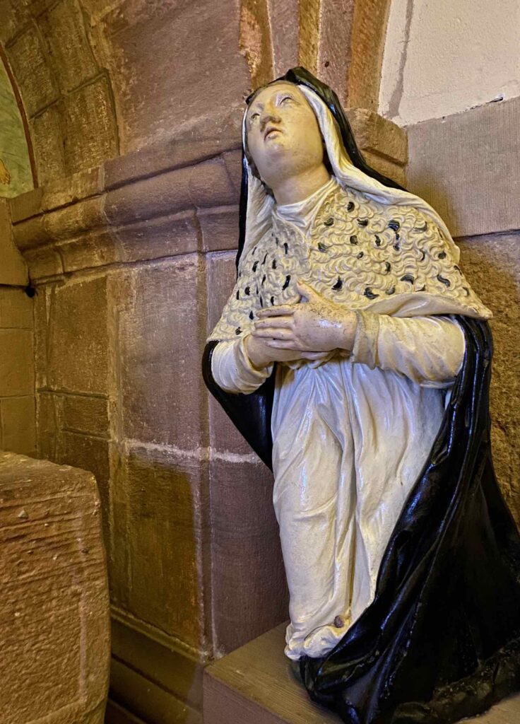 Je pourrais vous faire trois feuillets sur le sujet mais je vais essayer de faire court… La légende raconte qu’au VIIe siècle, le duc d’Alsace Adalric, qui espère un héritier mâle, voit naître une fille aveugle. Il veut la supprimer mais sa mère réussit à la sauver et la cache en Bourgogne. Jusqu’à ce qu’elle recouvre miraculeusement la vue, à l’âge de 12 ans, lors de son baptême. Quand elle veut retourner au château, conviée par son frère Hugues, c’est ce dernier qui subit la folie meurtrière du père, qui tue son fils…