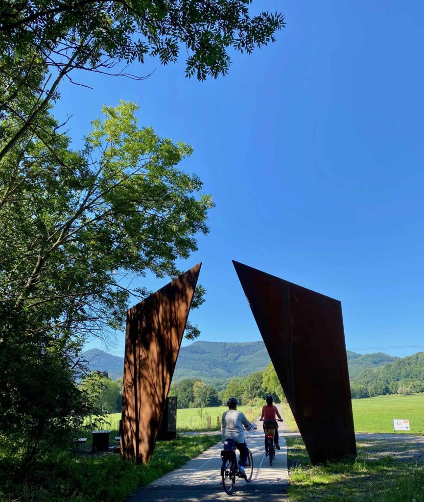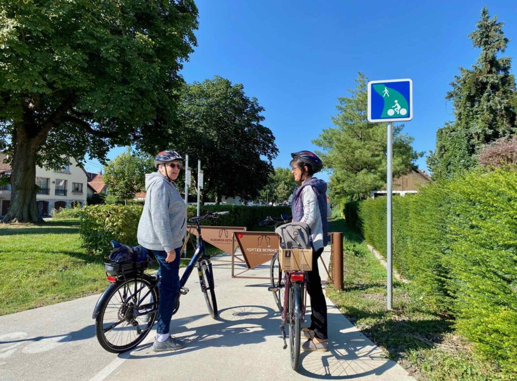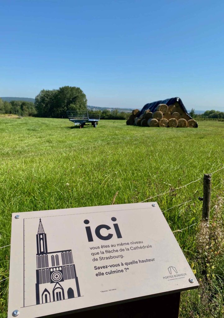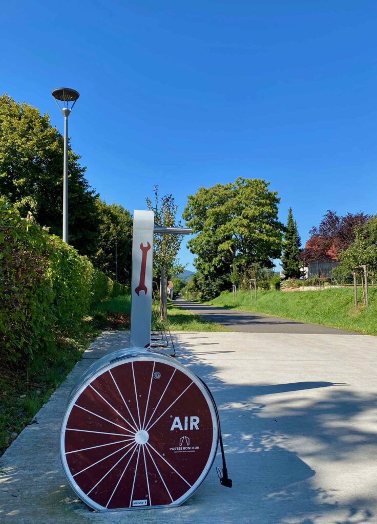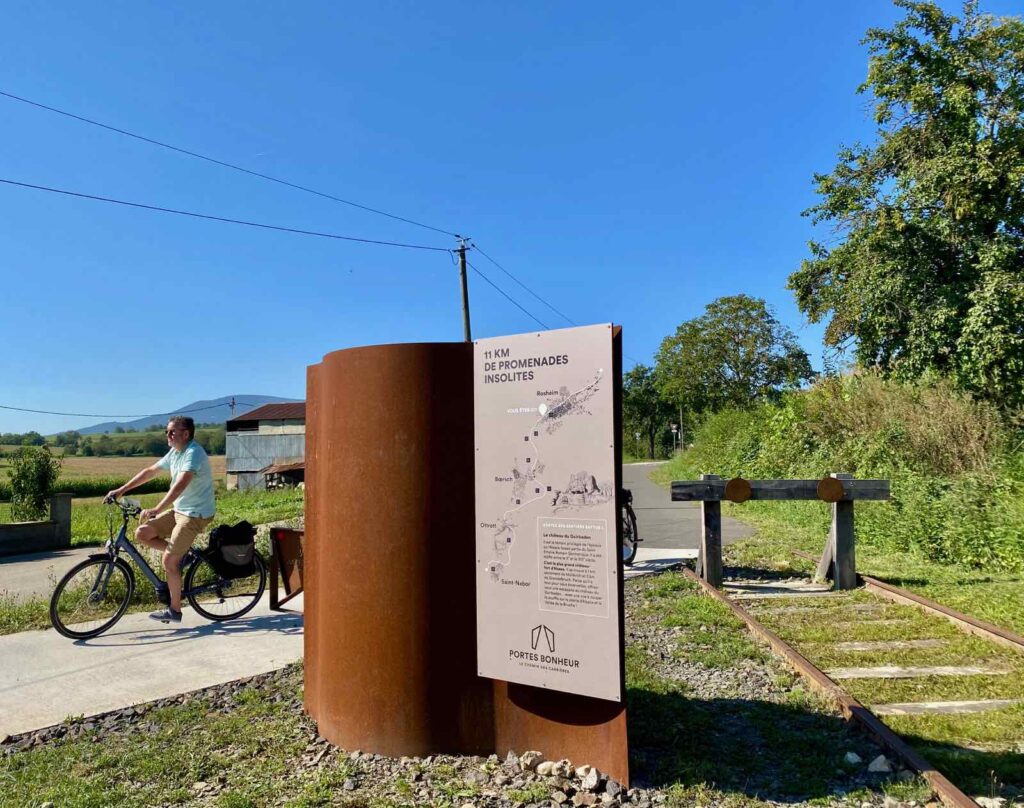 C’est ce que j’ai fait avec Dorothée de Mont Sainte-Odile Tourisme et avec mon amie Véronique, par une superbe matinée de la fin août. Après avoir cherché les vélos à l’OT, nous avons pris le départ, à deux pas de là, sur cette nouvelle voie verte, joliment baptisée « Portes Bonheur, le chemin des carrières ».