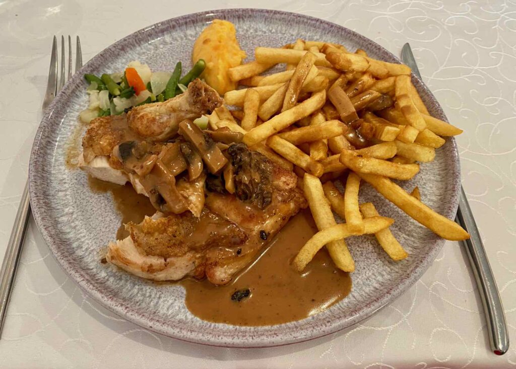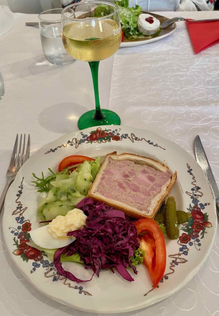 C’est une gentille petite table, qui mélange spécialités locales et bistronomie, à des prix vraiment doux. Ce jour-là, le menu affaire à 22 € proposait un pâté en croûte typiquement alsacien (que j’ai accompagné d’un non moins local verre de vin d’Alsace), suivi de poulet aux champignons. Avant un chaud/froid de quetsches, fruit alsacien emblématique que j’adore…