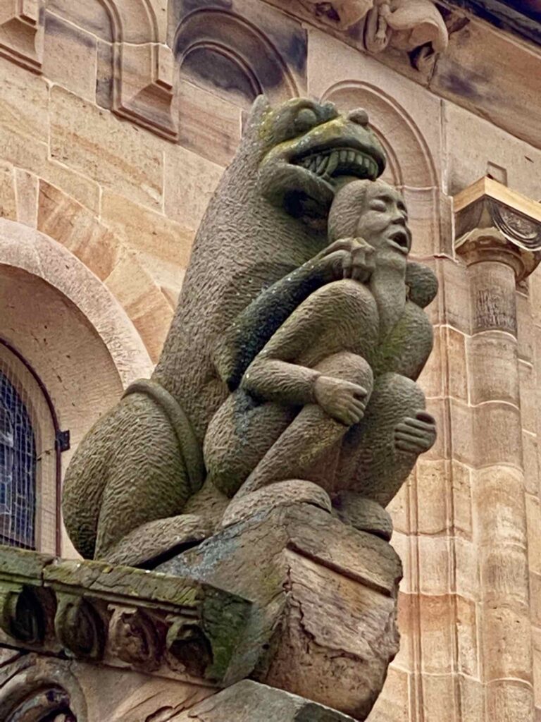 À l’extérieur, on s’amusera à chercher les différentes sculpltures de personnages et/ou d’animaux fantastiques. Ils sont terrassés par des fauves ou entrain de demander l’aumône…