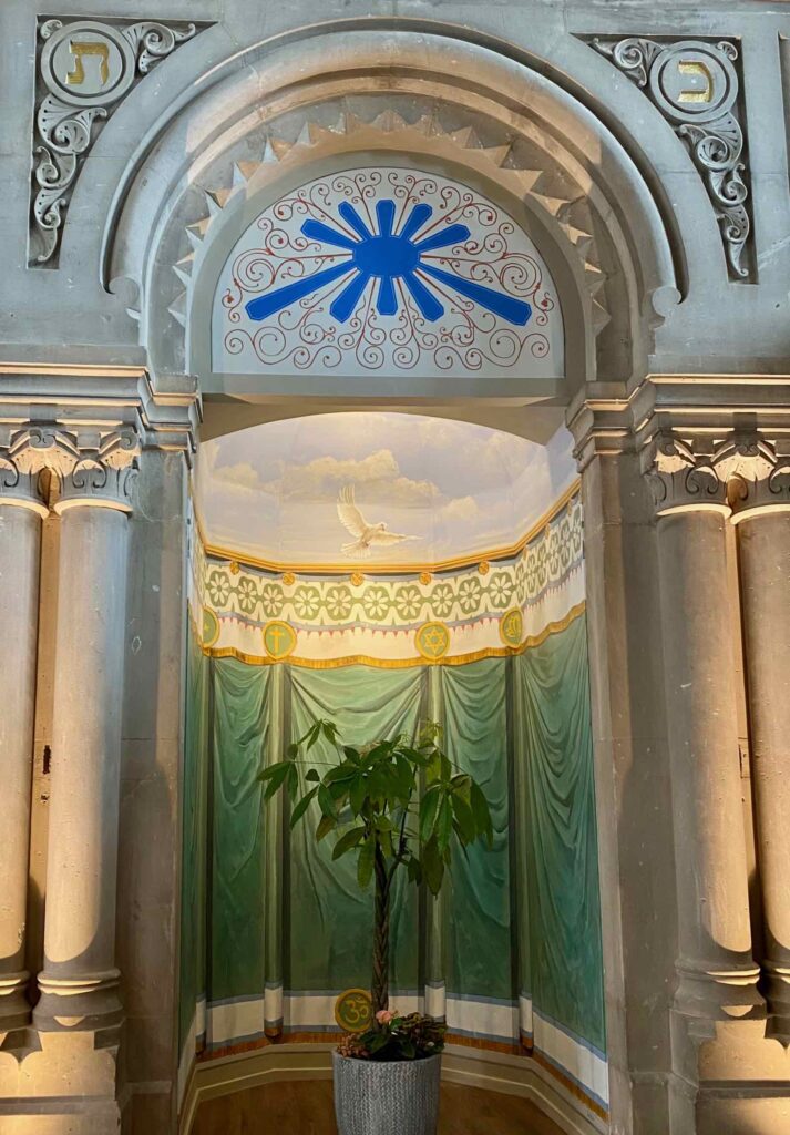 Mais ce que j’ai préféré, c’est la préservation de l’arche sainte, où sont traditionnellement conservés les rouleaux de la Torah. Respect des lieux mais sans prosélytisme puisque le nouveau propriétaire a remplacé les différents signes judaïques par les symboles des cinq principales religions du monde, surmontés par la colombe de la paix. Une jolie manière de prendre de la hauteur et de souhaiter la bienvenue à tous les visiteurs. D’où qu’ils viennent et quelles que soient leurs croyances…