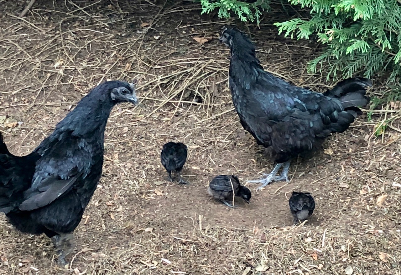Jardins de Ly Sénarpont Somme - poules Cemani avec poussins