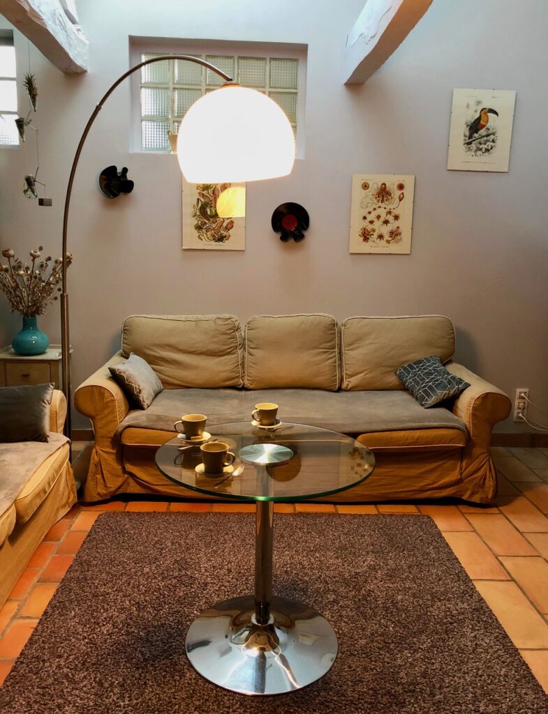 La cuisine donne d’un côté sur une chambre (que j’ai oublié de photographier, zut !) et de l’autre sur un somptueux salon.
