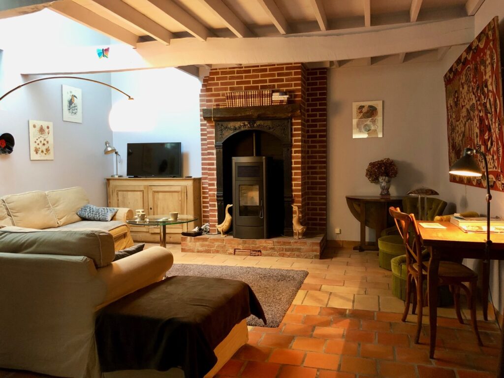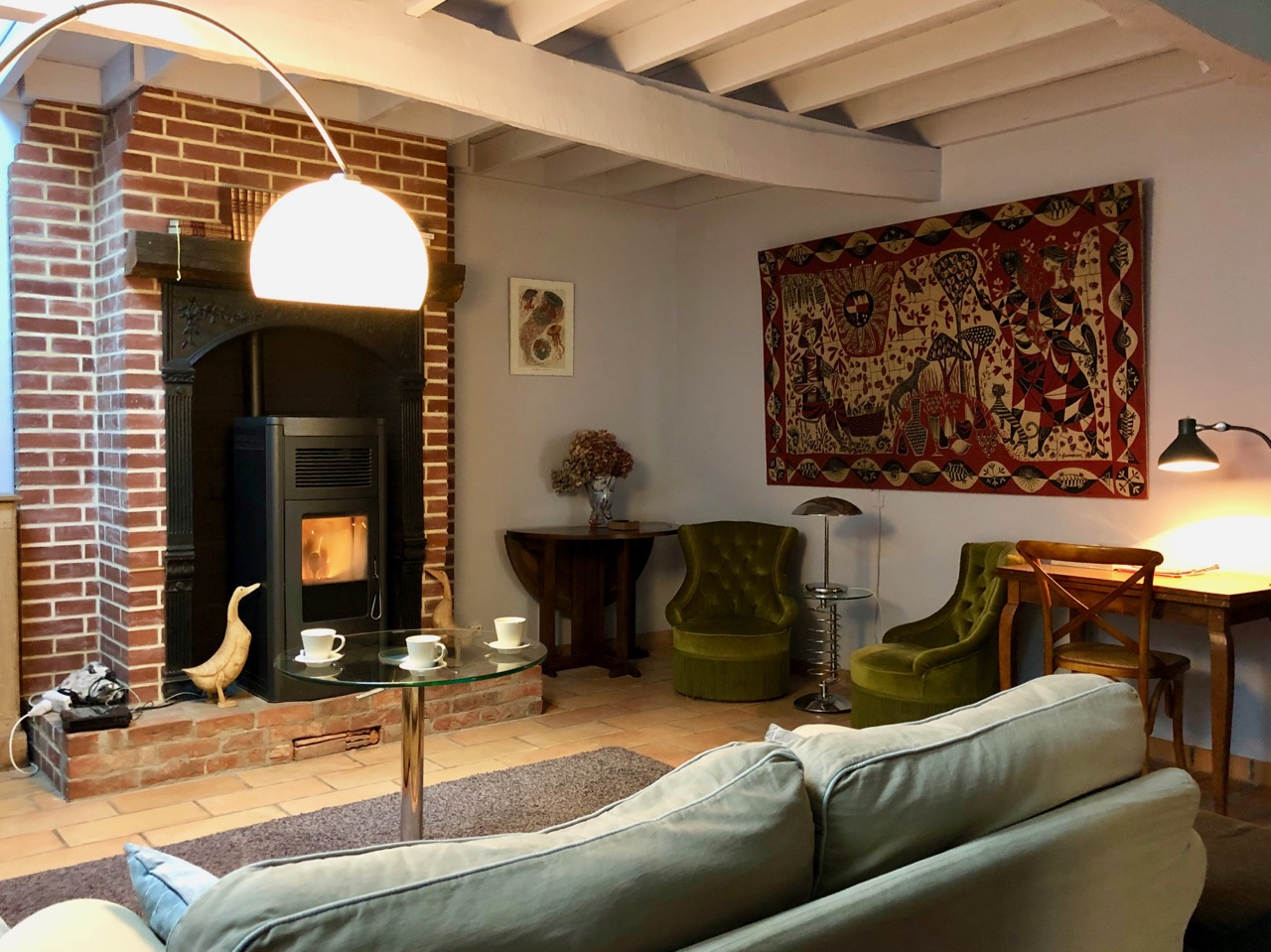Cette jolie maison en brique propose également un chaleureux salon avec son poêle en fonte.