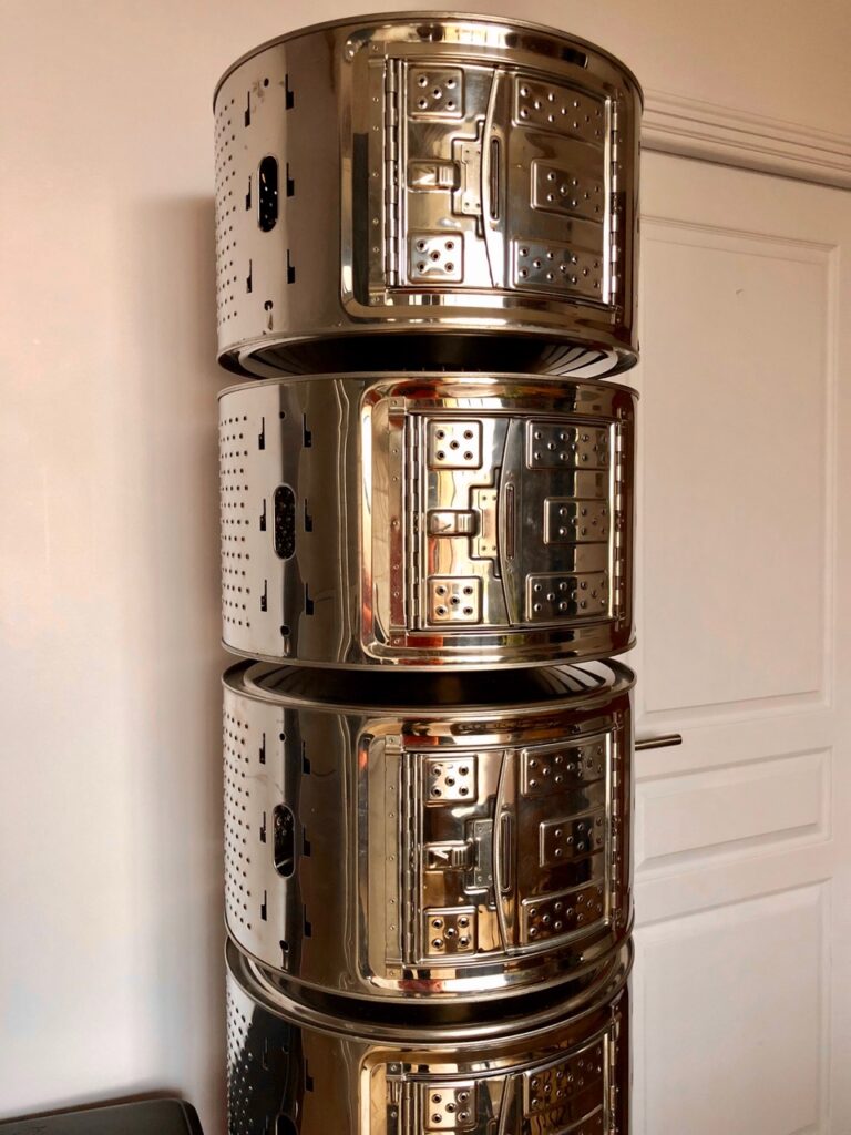 Mais le plus amusant dans la cuisine reste le placard rond… fabriqué avec une série de tambours de machines à laver. Fallait y penser, non ?