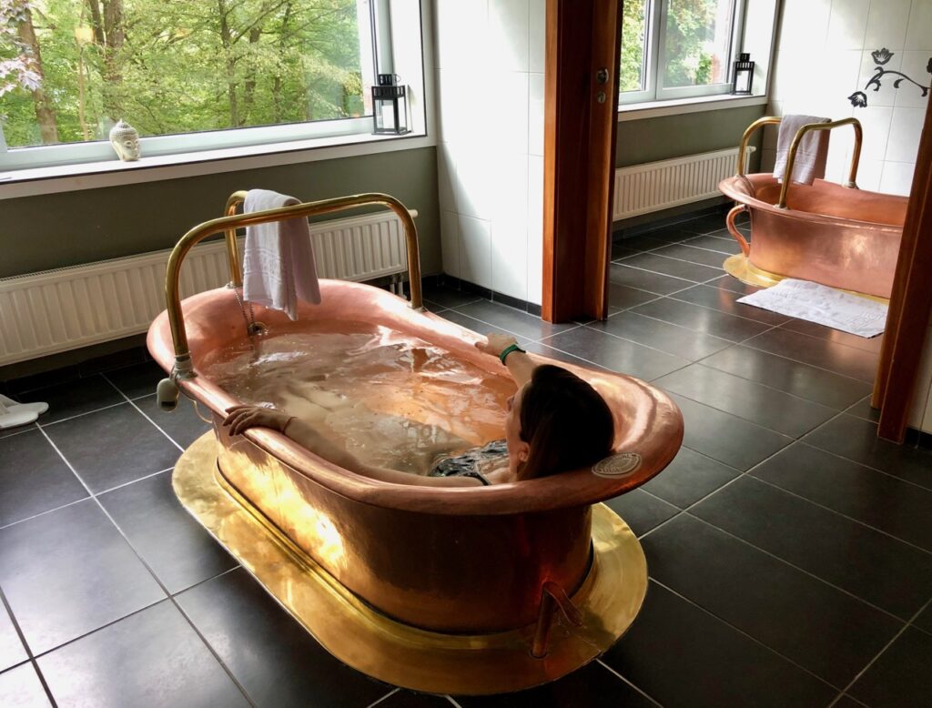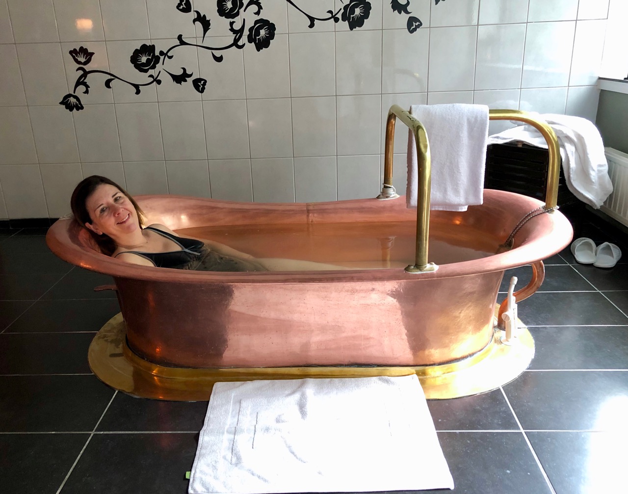 La dame qui m’a installée, m’a expliqué que cette eau Marie-Henriette, naturellement gazeuse, agit sur la circulation sanguine, diminue la pression artérielle et fait baisser le stress. Le tout dans une baignoire en cuivre, indispensable à la réaction de l’eau.
