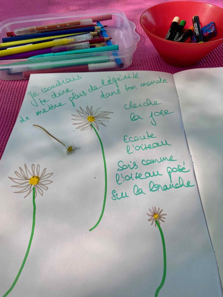 Puis Emmanuelle nous invite à marcher pieds nus dans la grande clairière et à ramasser un élément qui nous appelle. Pour moi, ce sera une petite pâquerette, que je suis ensuite invitée à dessiner. Pourquoi cette petite pâquerette et surtout qu’a-t-elle à me dire ? Réponse dans mon cahier… presqu’en mode écriture automatique.