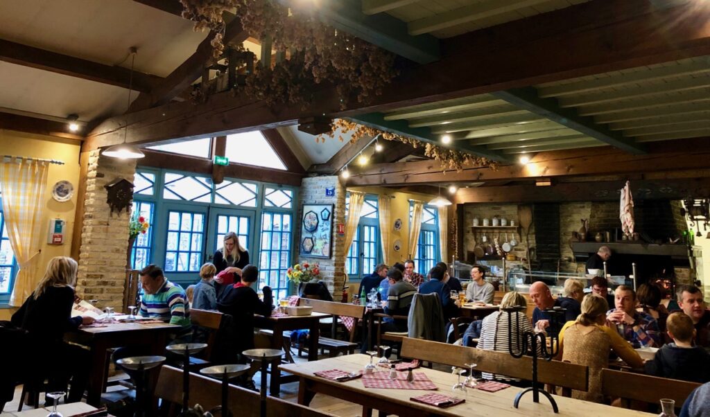 J’aime beaucoup la grande salle aussi, avec ses longues tables en bois, ses bancs et son plancher. Des guirlandes de houblon se balancent au plafond et l’ensemble fait presque plus penser à une grange qu’à une salle de restaurant.