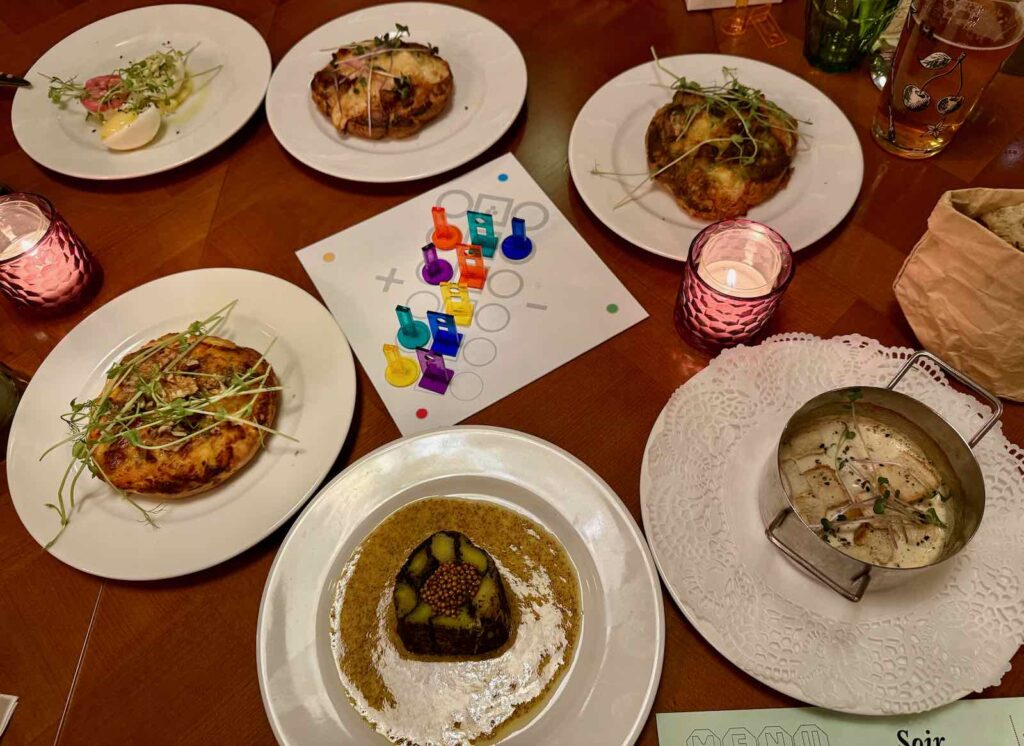 S’il y a de « vrais » plats à la carte du soir et du week-end (entre 16 et 25 €), nous avons préféré piocher dans les Apéro Mangettes et prendre huit portions à partager, suivies de desserts.