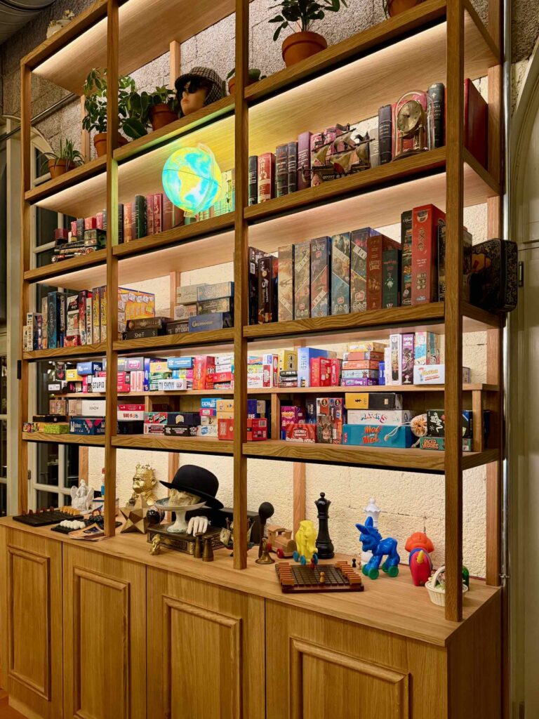 Le clou du lieu, c’est bien sûr les jeux de société. Même si tous ne sont pas encore en rayon, les bibliothèques sont déjà bien garnies et on n’a que l’embarras du choix parmi 500 boîtes ! Bluff, mime, culture générale, blagues, devinettes… il y en a pour tous les goûts, toutes les intelligences (avec même un jeu qui s’appelle Stupid !) et toutes les envies.