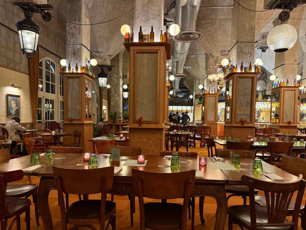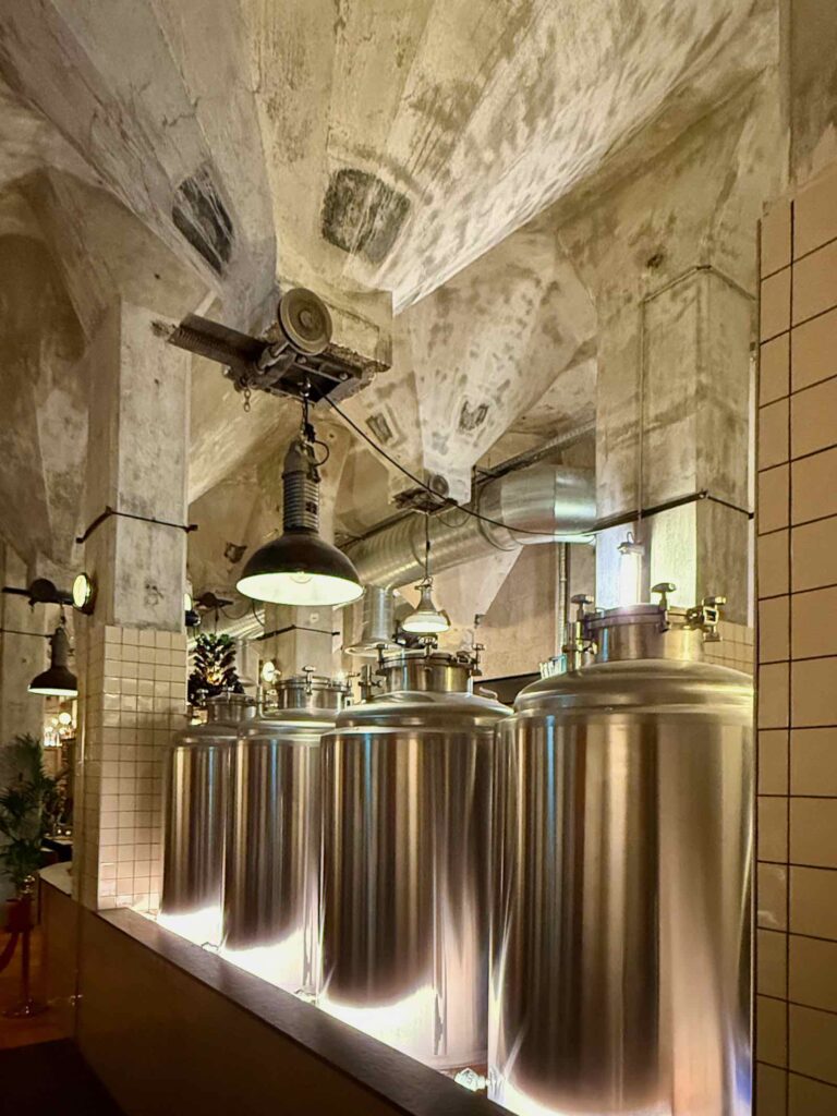 La pièce maîtresse de la nouvelle brasserie est sans doute le magnifique bar circulaire. Il propose notamment les bières à la pression, sorties des cuves situées sous les « tétines » des anciens silos.