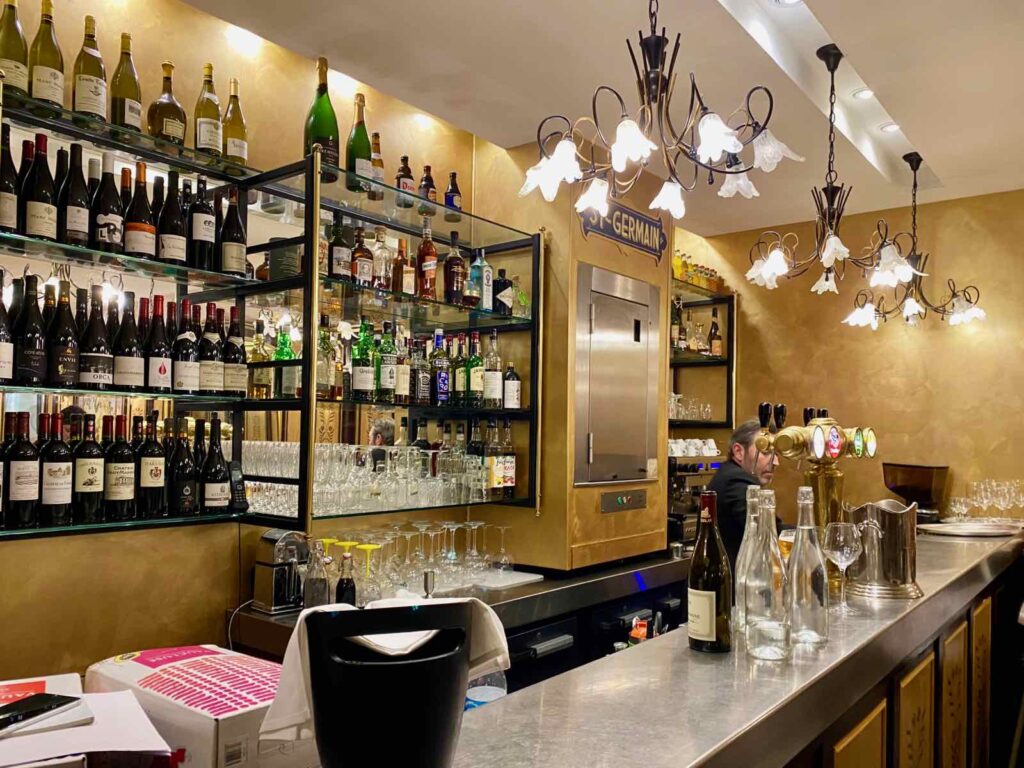 Banquettes de velours rouge et vitraux au plafond (de mémoire, ils étaient déjà là avant), images Art Nouveau et dorures en « coups de fouet » typiques de ce style, lampes tulipes et zinc au comptoir…