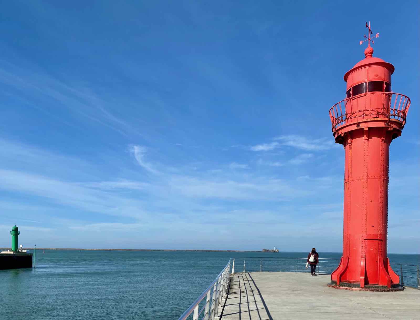 Du bout de la jetée du Phare rouge, on voit bien (j’ai triché en le grossissant un peu, d’où un flou artistique…) le seul phare de la région classé « phare en mer ». Il est situé au bout de l’autre digue de Boulogne-sur-Mer, la digue Carnot. Coiffée d’un chapeau vert, sa tour cylindrique culmine à 22 mètres, à environ 3 kilomètres de la terre ferme…