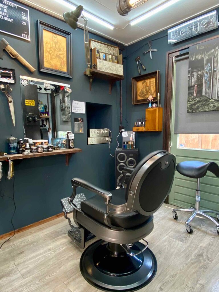 Et il y a un barbier, dont le joli local est entièrement fait de matériaux recyclés.