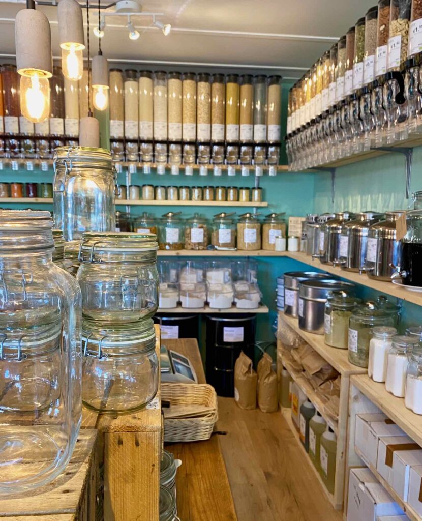 Il y a un stand de vêtements de seconde main. Une entreprise qui recycle le plastique. Et un magasin où tout est vendu en vrac, sans plastique.