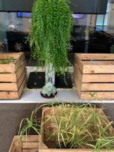 Avec mon amie Agnès, nous poussons la porte de la rue du Bleu Mouton et là, tout de suite, zénitude. La grande cloison de verre bleutée, les troncs de bouleau et les caisses en bois contenant de petits bambous vous mettent tout de suite dans l’ambiance.