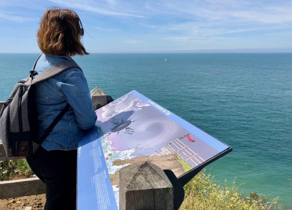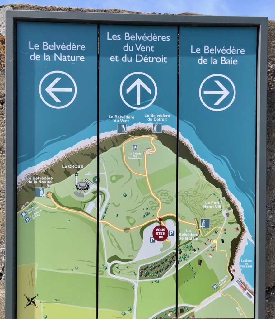 Certains trouvent le Gris-Nez trop aménagé, plus assez sauvage et lui reprochent même d’avoir de petits airs de parc d’attraction ! Moi je ne dirais pas cela. J’aime bien les sentiers balisés, ultra faciles, avec un parcours jalonné de panneaux d’information. Comme celui-ci, qui accueille le visiteur et lui explique comment « fonctionne » le Gris-Nez.