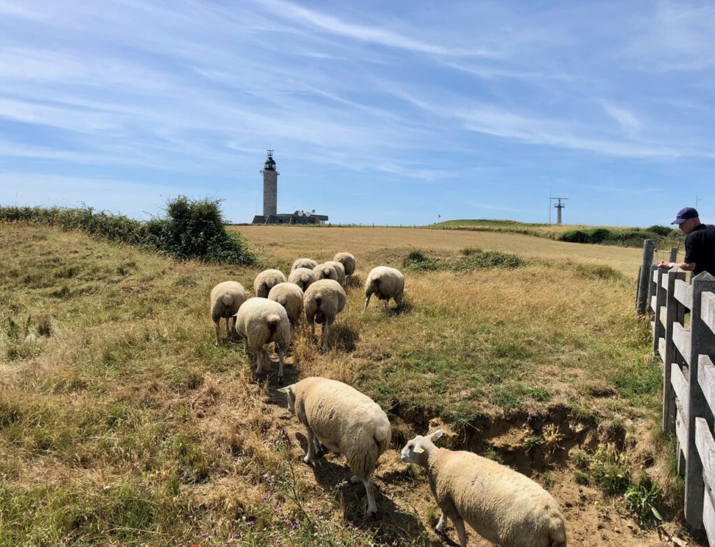 Dès le début de la promenade, on croise des moutons boulonnais, la race la plus septentrionale de France. Rustique et solide, elle est bien adaptée au climat local… plutôt venteux il faut le dire !