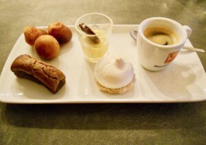 Et le café gourmand ? Eh bien il était vraiment gourmand ! Trois petits financiers aux amandes, un brownie chocolat/noisettes, une meringue à la crème de spéculos et une ganache de fruit de la passion, comme tout cela était joli et bon !