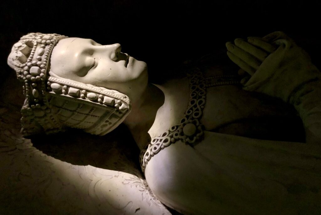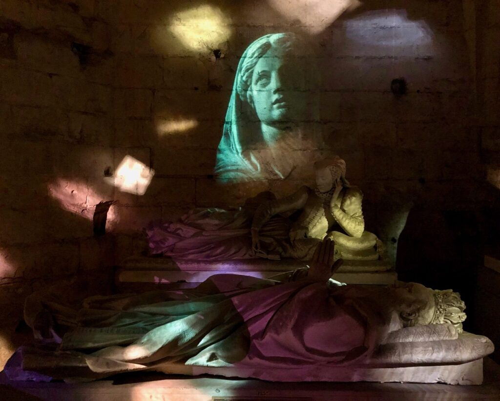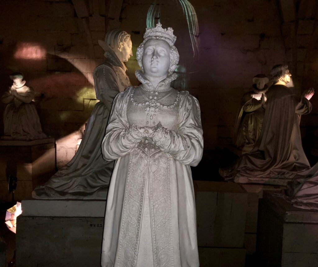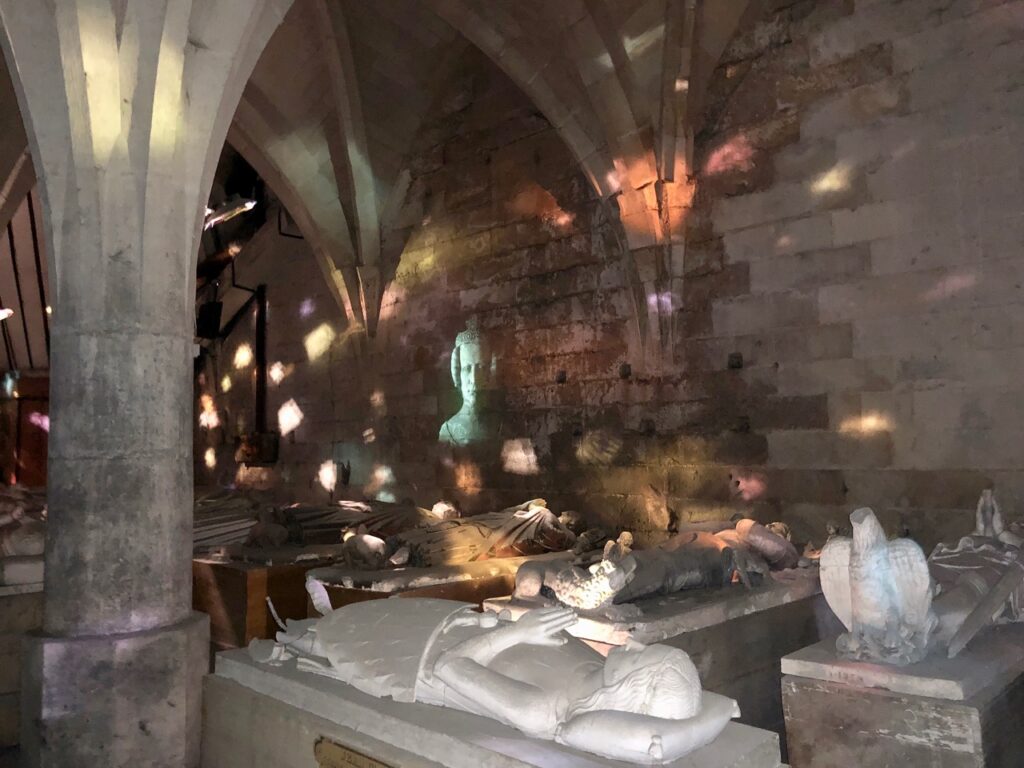 Sous les voûtes médiévales, un jeu d’ombres et de lumières éclaire les figures de plâtre, dont les originaux sont à la basilique Saint-Denis.