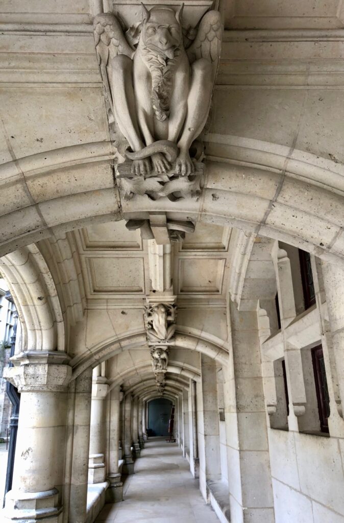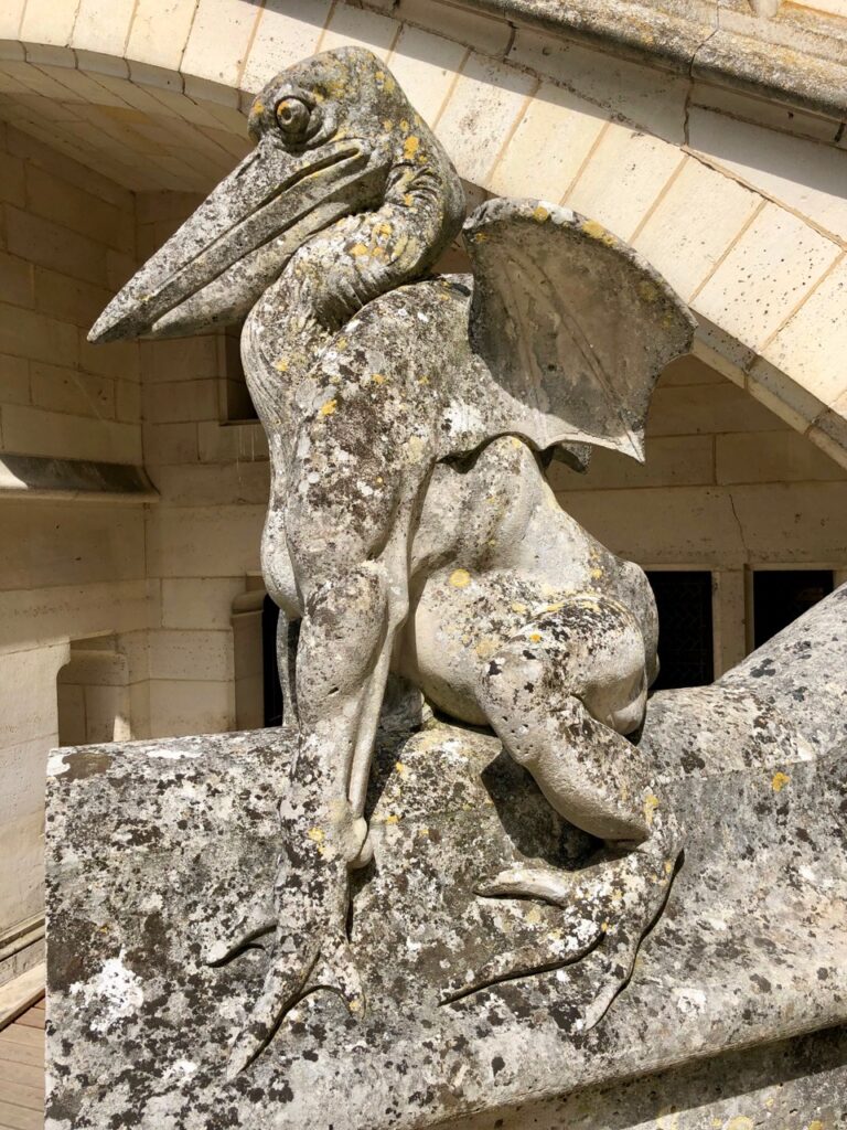 Assis sur la rampe d’escalier de la chapelle ou dominant le passage le long du corps de logis de style Renaissance, ils sont partout. Amusez-vous à les trouver… et à deviner quels animaux les composent.