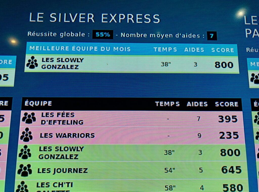 Le taux de réussite du Silver Express étant de 55 %, nous avons donc fait partie des 45 % de « loosers »… Mais je me console en constatant que notre score de 395 reste supérieur à celui de l’équipe des Warriors qui nous a précédées. On se console comme on peut…