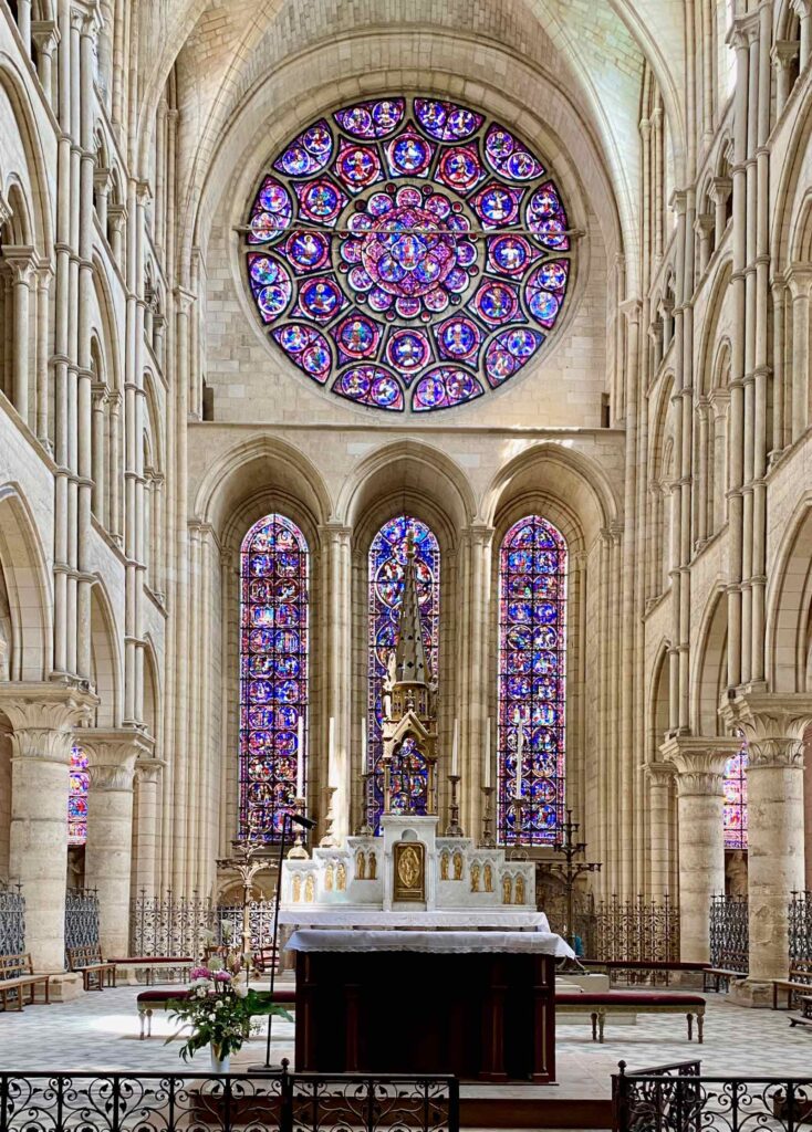Admirez la rose du fond, qui répond en écho à celle de la façade. Plus des trois quarts des vitraux du chœur sont encore ceux d’origine, créés au XIIIe siècle.
