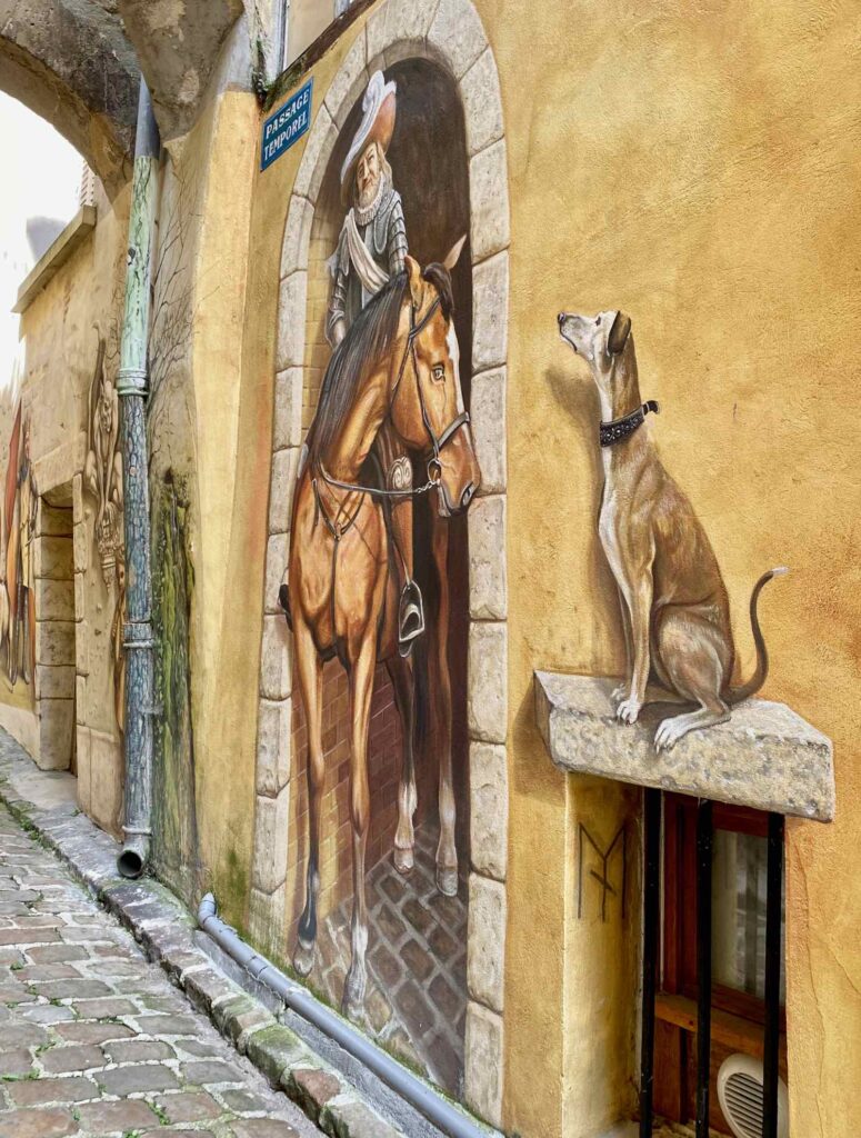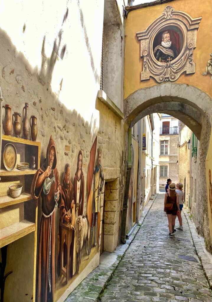 Partant de cette rue Châtelaine, vous ne manquerez pas la ruelle des Neufliers, décorée par le peintre laonnois Pierre Grenier. Quelques fresques et nous voilà revenus dans le passé de Laon…