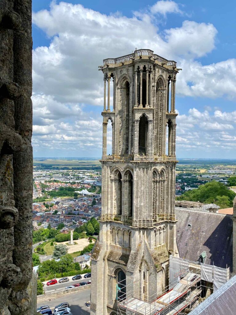 Au premier étage, vous serez à environ 24 mètres de haut, avec déjà un joli panorama sur la cité médiévale de Laon. Puis vous emprunterez un second escalier, plus étroit que le premier, pour arriver à 40 mètres de haut. La vue y est encore plus belle, sur la ville, les alentours mais aussi les tours de la cathédrale. À l’origine elles devaient être au nombre de 7, au final elles ne seront que 5…