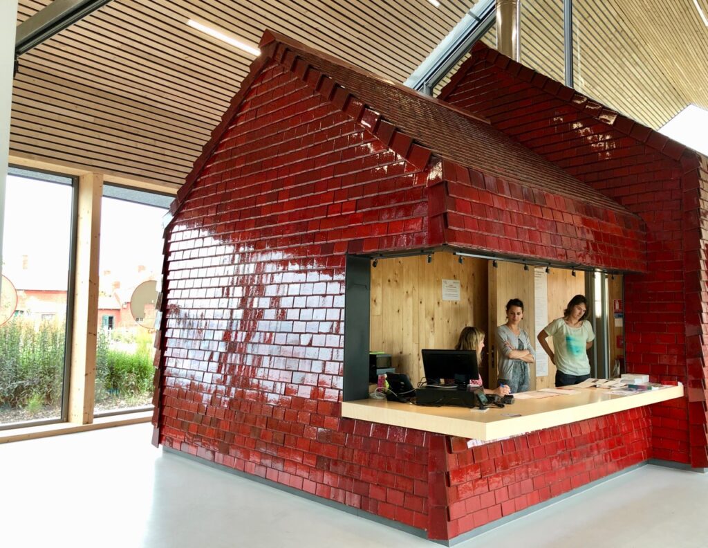 La visite commence dans le barreau 1, un monolithe tout rouge, intégralement recouvert de tuiles vernissées, y compris sur le toit.