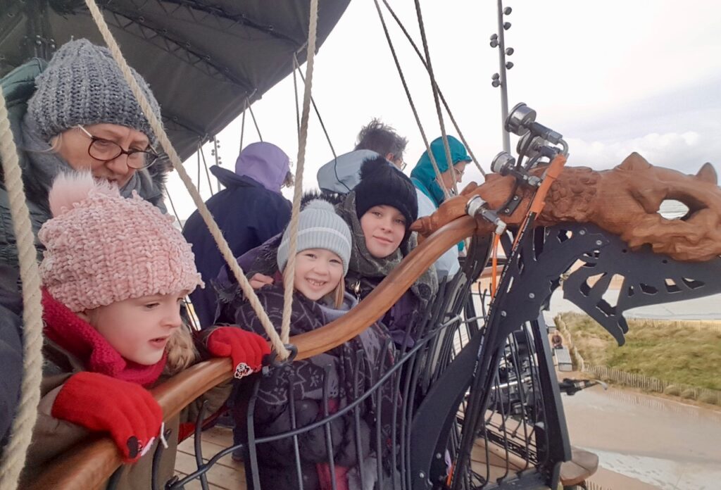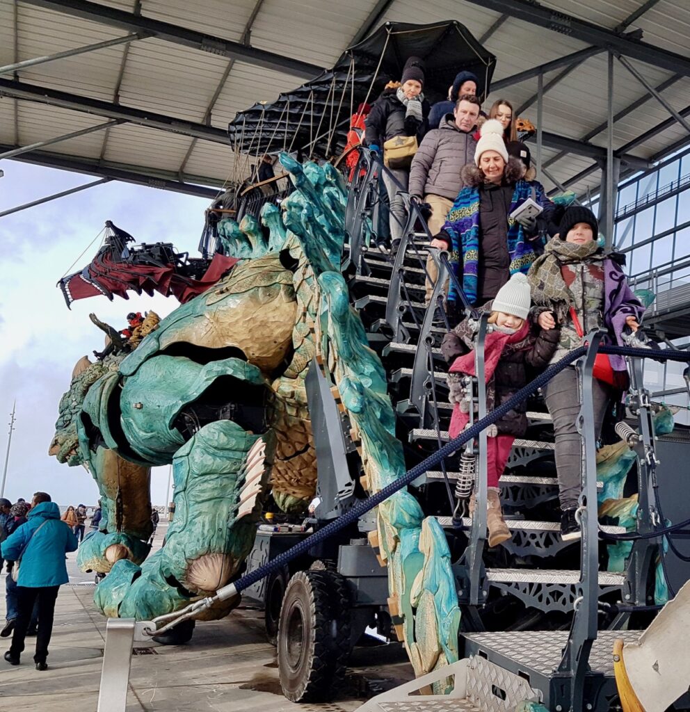 Début novembre, un reportage m’avait donné l’occasion de faire connaissance avec le Dragon de Calais, qui effectuait sa toute première sortie dans la ville. Une rencontre très impressionnante mais un peu lointaine vu le monde qui entourait la bestiole ! Du coup, retour sur la côte par un froid dimanche de mars, pour tester la très demandée balade à dos de Dragon. À quatre, avec Octavine, 12 ans, et Maïly, 7 ans, qui trépignaient d’impatience…