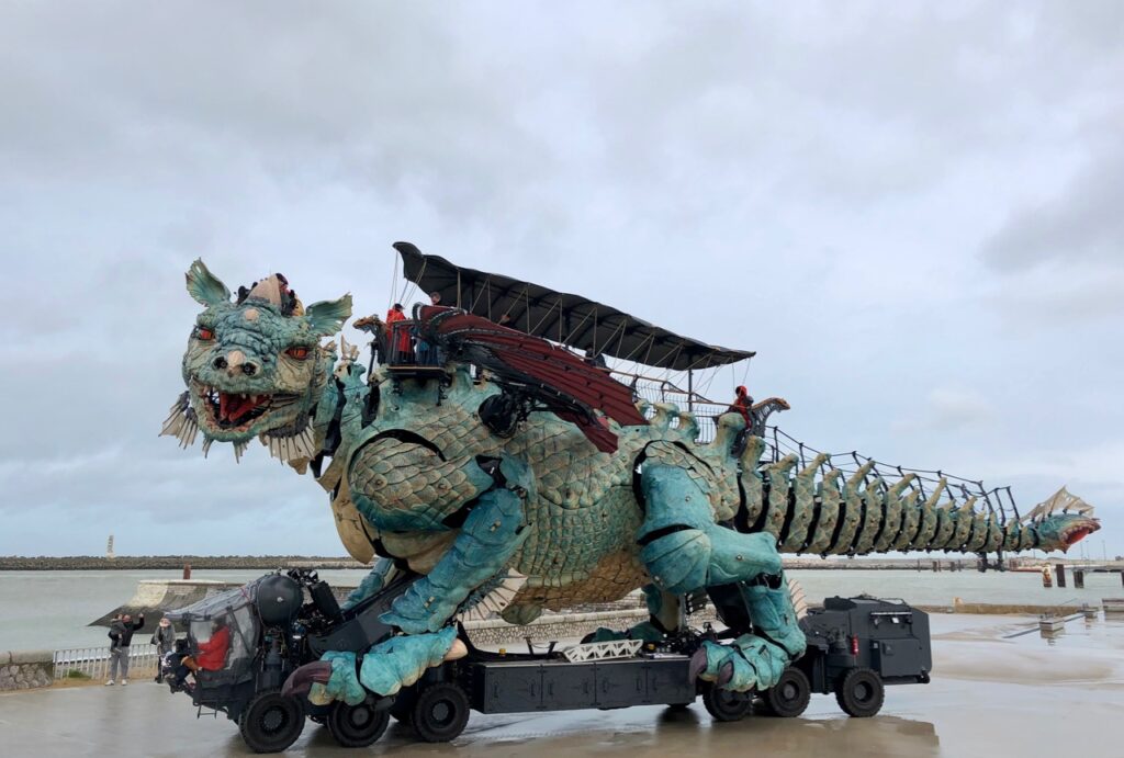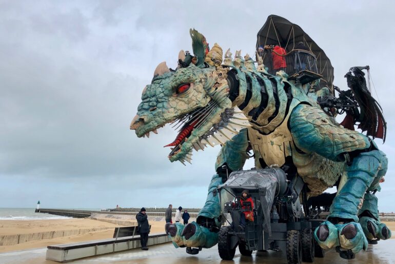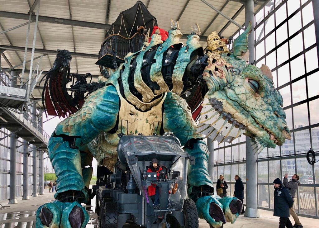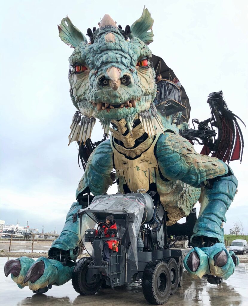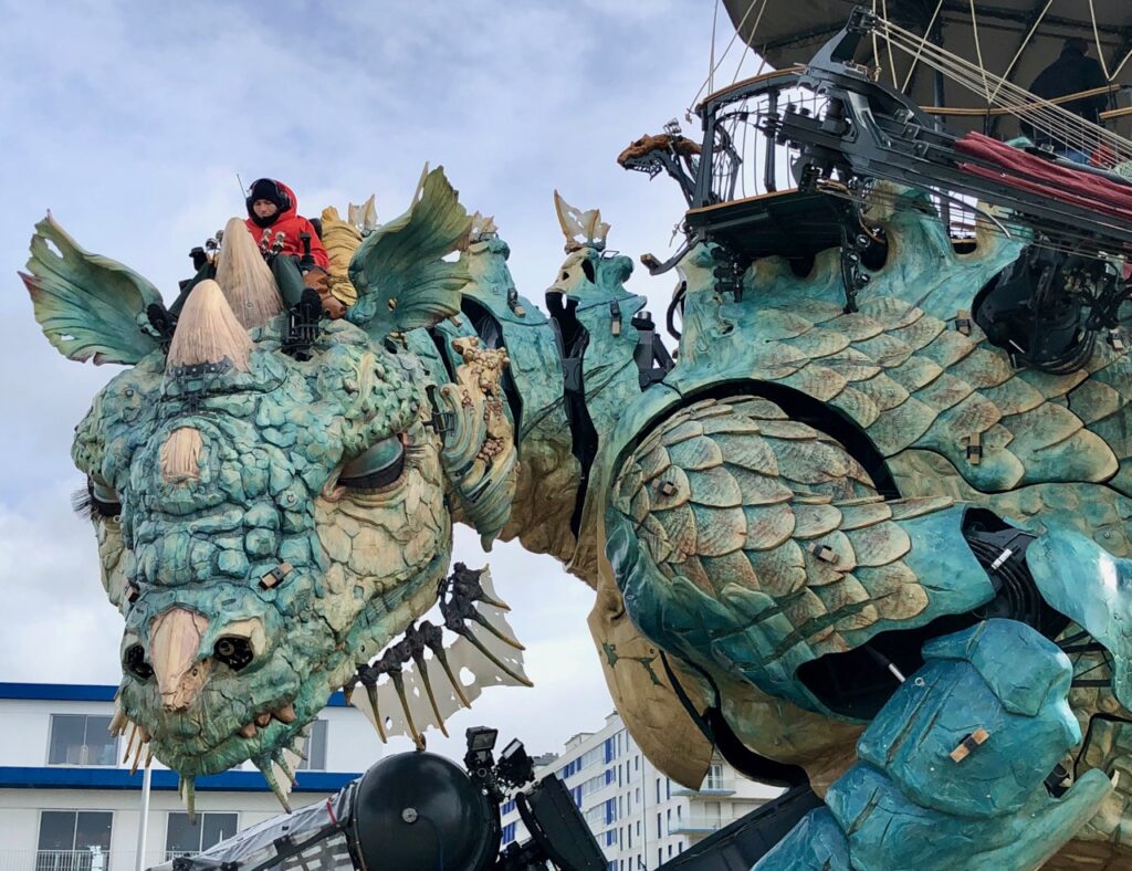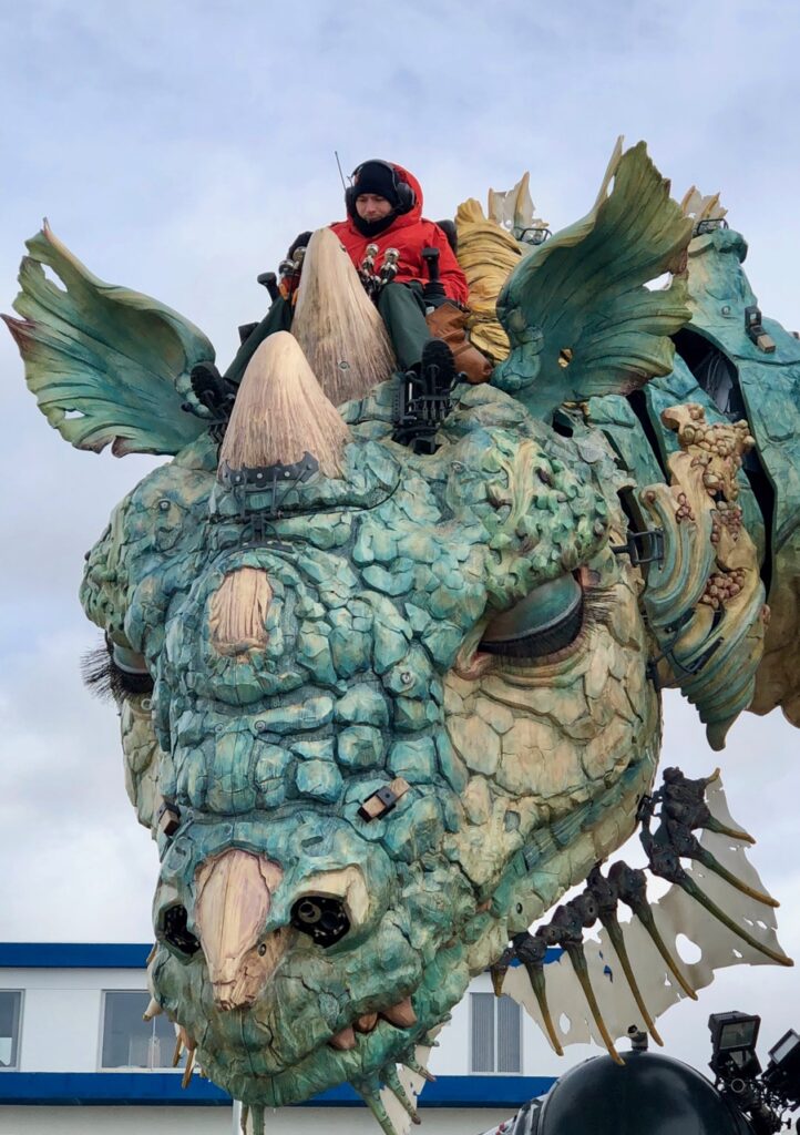 Sachez aussi que son corps de bois et d’acier, protégé par quatre couches de peinture et de vernis, est actionné par 150 vérins hydrauliques, dont 30 pour la seule tête. Côté propulsion, le Dragon de Calais est hybride, fonctionnant à la fois au diesel et à l’électricité. Mais ne m’en demandez pas plus sur le sujet… Je sais juste qu’il a six roues à l’avant et autant à l’arrière. Et qu’il peut marcher en crabe…