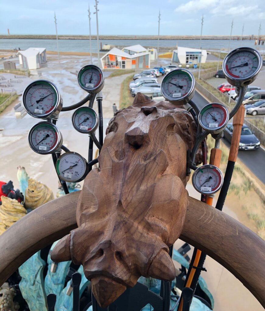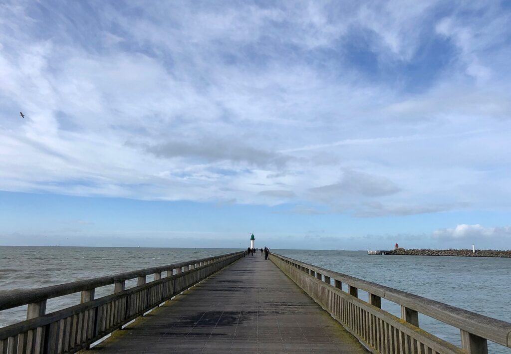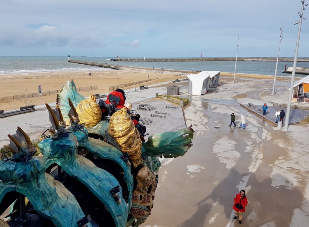 Arrivés au poste de secours, sur la digue, notre tour était venu d’embarquer. Car oui, cela se passe ainsi. Les uns ont droit à la promenade de l’abri de l’avenue W. Churchill jusqu’à la digue, tandis que les autres font le chemin inverse. Nous avons donc emprunté l’escalier qui grimpe le long de la queue du Dragon de Calais.