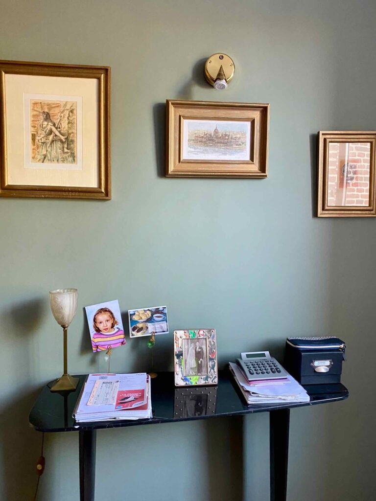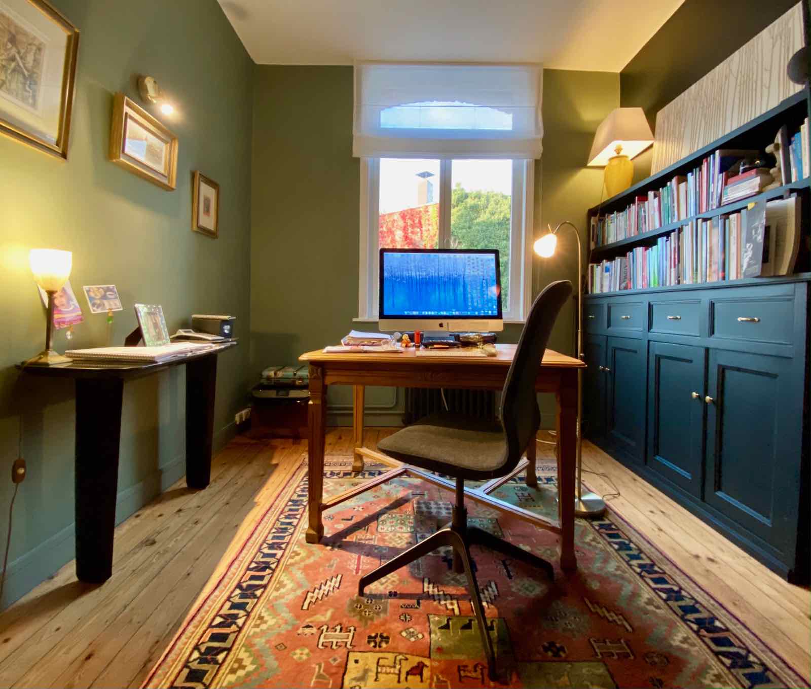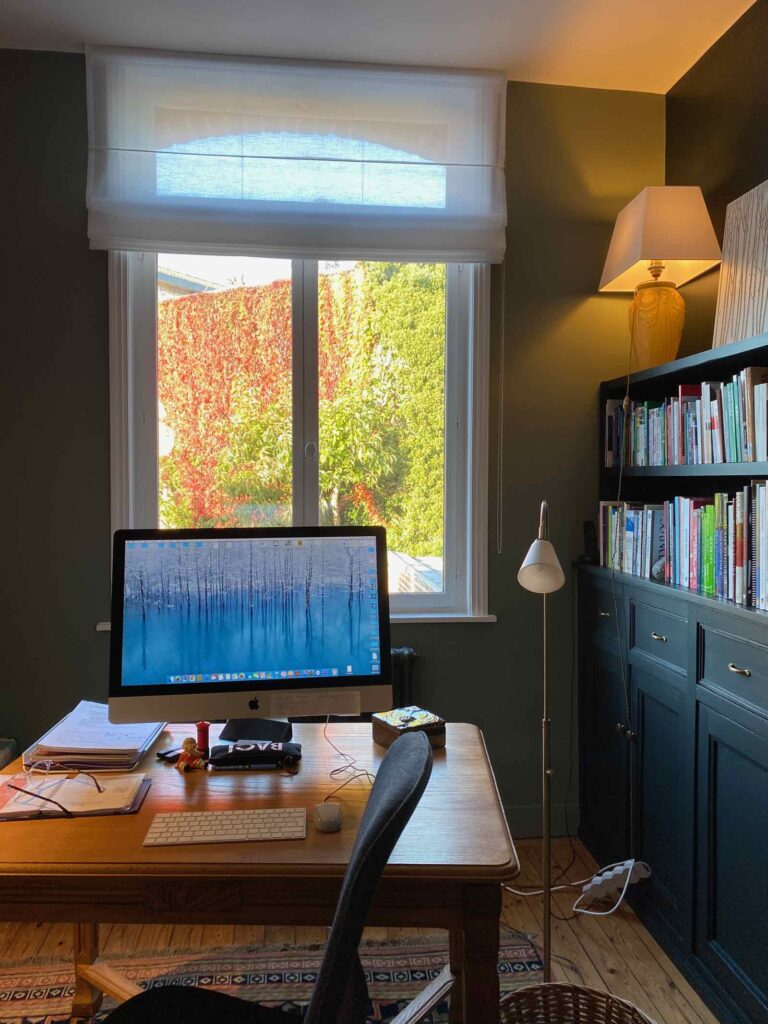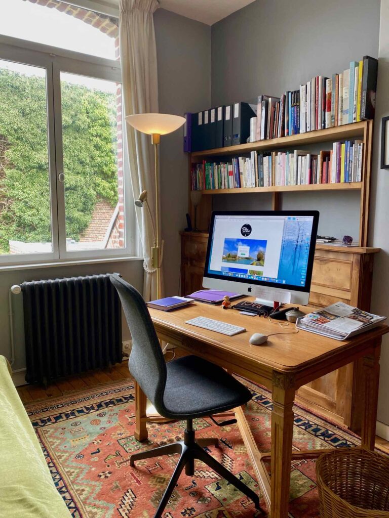 Après avoir replacé les livres, j’ai remis mon tapis, avec ses touches de vert de gris, les mêmes que la peinture des murs. J’ai aussi conservé ma table de travail en chêne naturel et mon siège de bureau pivotant de chez Ikea. Mais je les ai orientés autrement, tournés vers la fenêtre. Cela me permet de rêvasser quelques minutes, en regardant le ciel ou le mur végétalisé du fond du jardin, tout en cherchant l’inspiration…