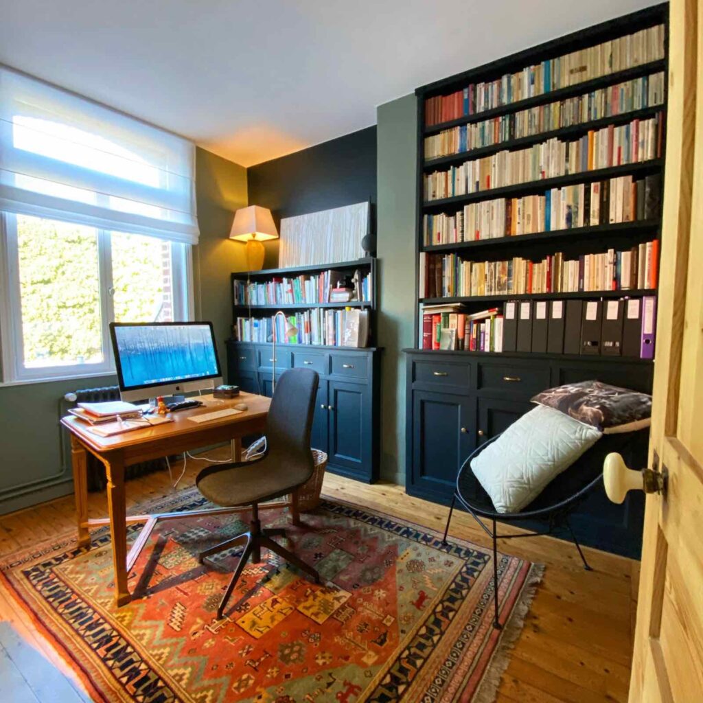 À la fois chic et cosy ce nouveau bureau que j’ai eu la chance d’admirer en vrai! Gros coup de coeur sur les couleurs, surtout le noir de la bibliothèque. Il fallait oser… mais c’est très réussi! En te souhaitant de magnifiques heures dans ton laboratoire d’écriture.