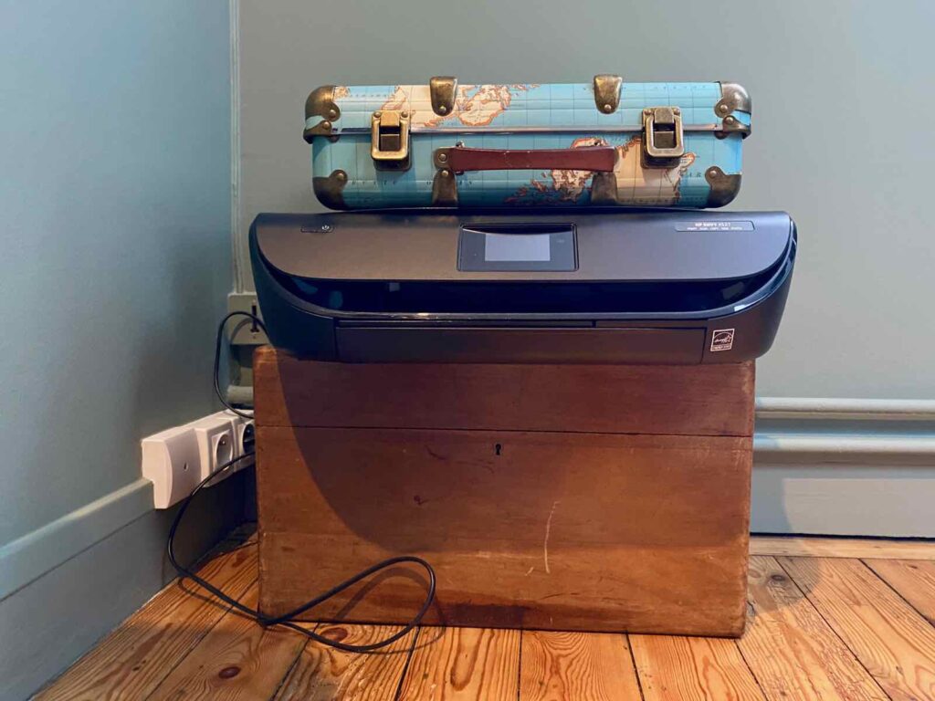 Près de la bibliothèque de mon bureau, j’ai remplacé la chaise à accoudoirs en cannage par le fauteuil noir en plastique de mon salon. Quant à mon imprimante, elle trône à présent dans un coin de la pièce, posée sur l’ancienne boîte à couture de ma chère grand-mère. Le tout est surmonté d’une valisette, décorée d’une map monde, offerte par mon ami Axel de CroisiEurope. Souvenir d’un mémorable anniversaire, le même mois que la création de Plus au nord…