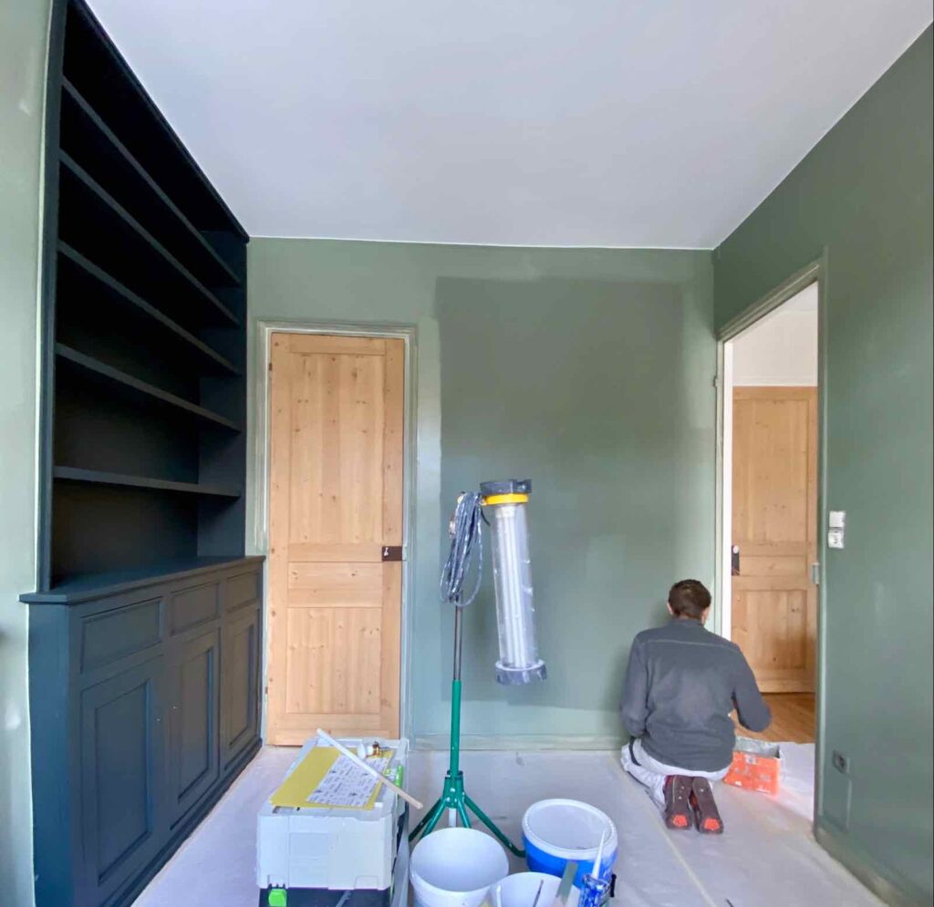 Je savais depuis un moment que je souhaitais du vert de gris sur les murs de mon bureau et du noir sur la bibliothèque pour un côté très flamand. Restait juste à choisir les bons tons, le nuancier de Julien étant plutôt bien fourni.