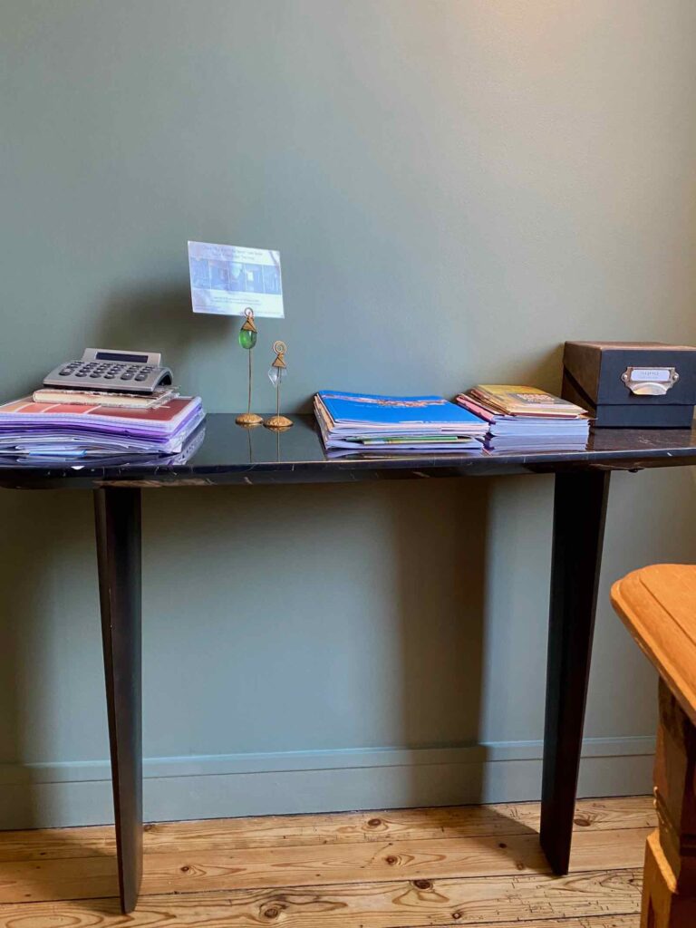 J’ai aussi investi dans une superbe (enfin je trouve) console en marbre noir, appelée Dolmena et trouvée chez AMPM (environ 600 €). Grâce à elle, j’ai toujours dossiers de presse, notes et autres documents, juste à portée de main…