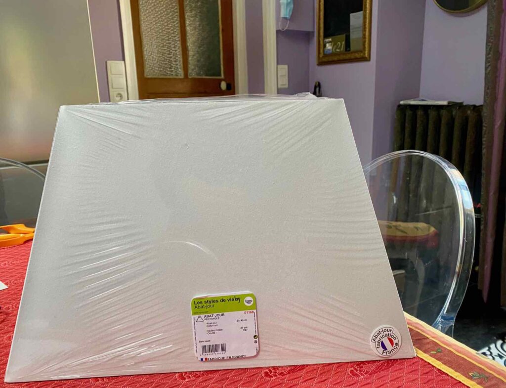 J’ai récupéré au deuxième étage deux lampes Art déco au pied jaune et je les ai habillées de nouveaux abat-jour. Je les ai choisis en forme de pyramide, afin que les lampes prennent le moins de place possible. J’ai placé l’une dans mon salon et l’autre sur la bibliothèque de mon bureau.