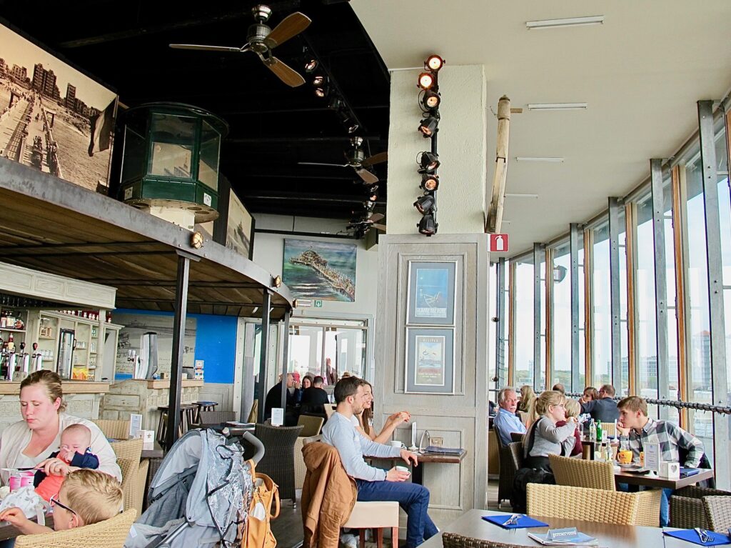 Au bout, une rotonde qui abrite (notamment) une taverne. On s’y engouffre vite fait les jours de grand vent. L’été, on préfèrera bien sûr s’installer en terrasse. Mais pour l’instant, ce n’est pas de saison et on apprécie de trouver une table juste derrière les grandes baies vitrées. Si possible les yeux tournés vers les flots plutôt que vers le front de mer archi bétonné et plutôt laid, il faut bien le dire.