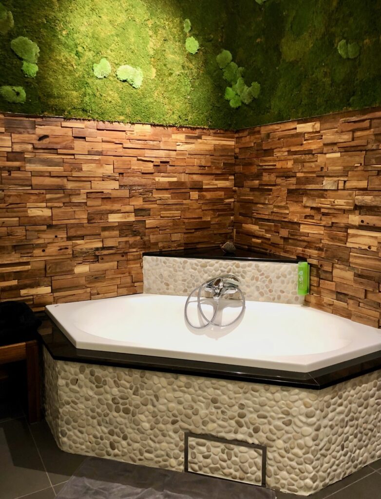 Côté salle de bains, ce n’est pas mal non plus… Le coin baignoire a été aménagé dans un esprit rivière, avec une plage de galets autour, la mousse du sous-bois (avec des empreintes d’ours…) et du bois au mur… Un peu comme si on plongeait dans une forêt des Ardennes belges…