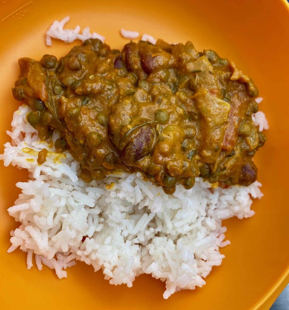 En plat, une sympathique mixture composée de lentilles vertes, haricots rouges, ail, oignon, gingembre, tomates, curcuma, cumin, curry, paprika, garam masala, le tout adouci par de la crème fraîche 😋 (je n’en espérais pas tant !)