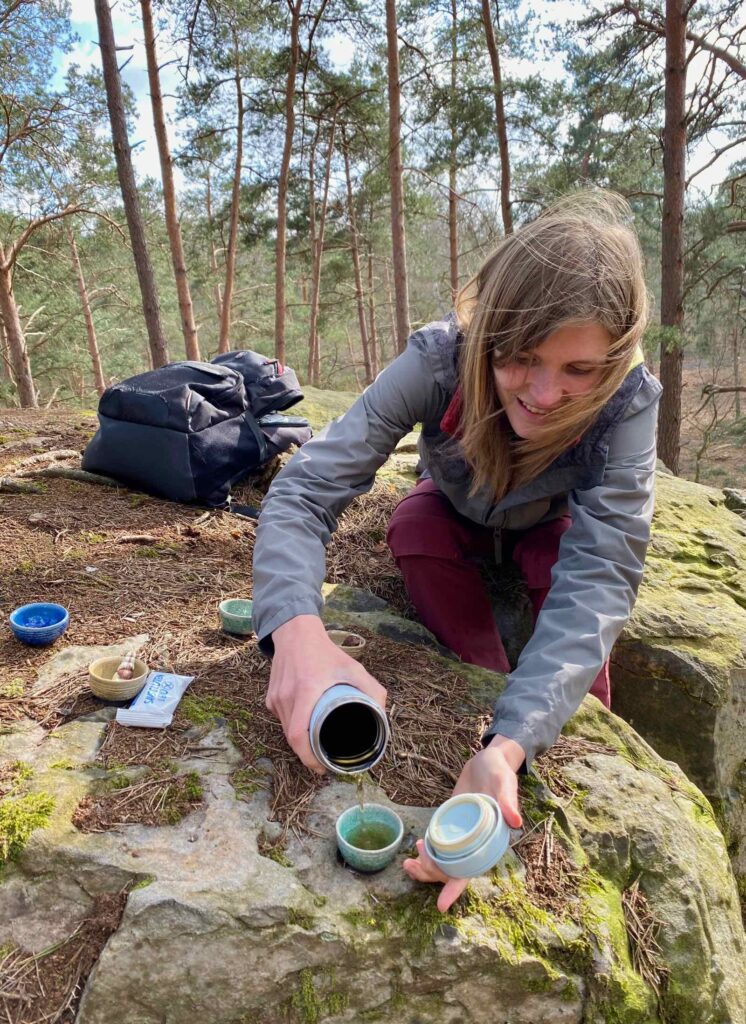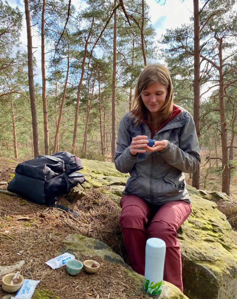 - Commençons par la fin, j’ai adoré la cérémonie du thé, qui termine en beauté le bain de forêt (celui de trois heures en tout cas). Julia a choisi un ensemble de rochers pouvant servir de table et de bancs, avant de sortir mini tasses, thermos et mini goûter de son sac à dos.