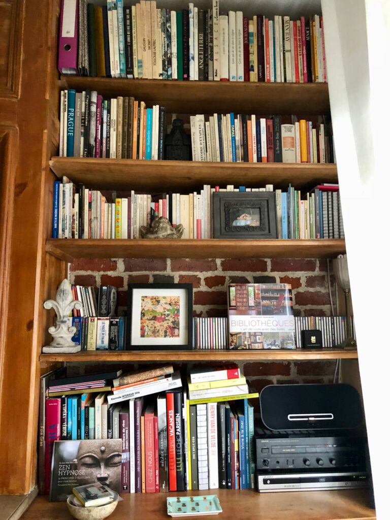 Dès le printemps 2001, Monsieur a décapé et remis à niveau le parquet qui en avait bien besoin. Il a aussi fabriqué une bibliothèque en chêne, très belle mais qui ne contient qu’un quart de mes (nombreux) livres. Et, quelques années plus tard, il a remplacé le papier peint un peu orangé par un jaune très pâle. Il était alors dans sa période (très) jaune…
