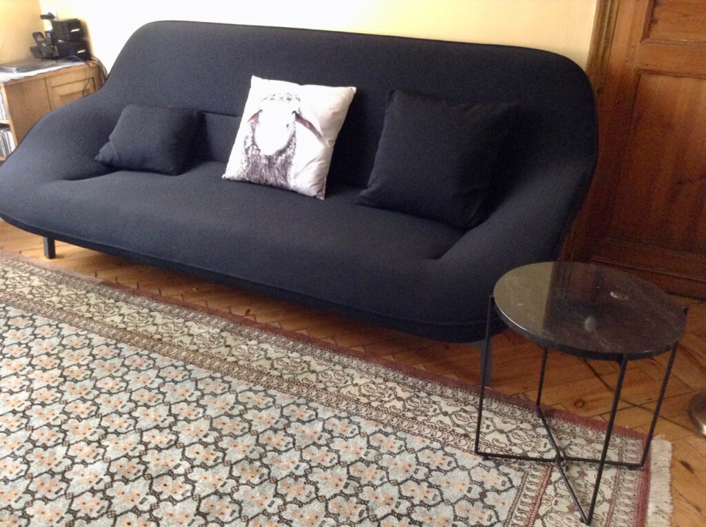 Un an plus tard, début 2017, gros gros ras le bol du canapé. Je commence à me balader sur divers sites mais aussi dans des (vrais) magasins. Du bon marché et du cher. De l’intemporel et du moderne. Du belge et du français. Mais pas l’ombre d’un feeling. Du coup, je laisse provisoirement tomber. Jusqu’au jour où je passe devant Cinna, rue Esquermoise à Lille, et je vois dans la vitrine un canapé hyper dépouillé, contemporain et assez rigolo.