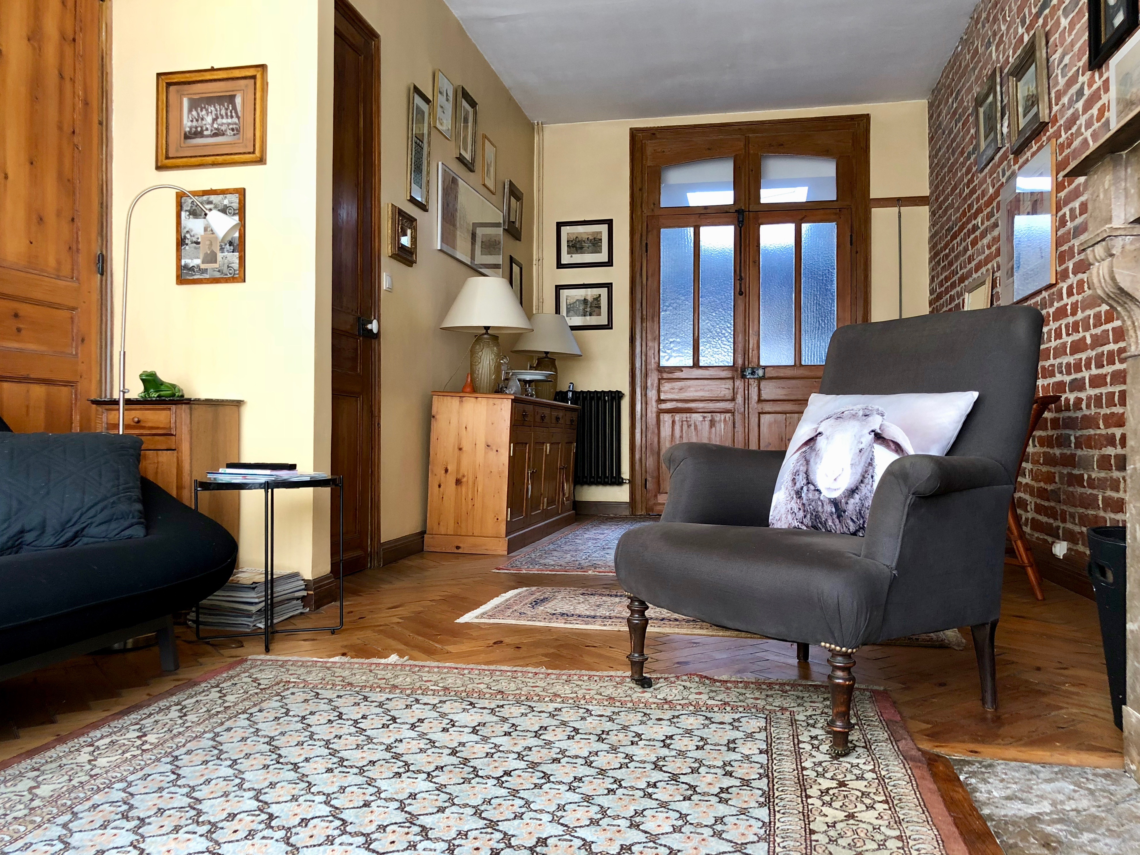 Évidemment, je n’ai pas touché au mur en brique du salon, mis à nu par M. et Mme Sans Goût, la seule chose de goût qu’ils aient entreprise dans cette maison. Oui, c’est vrai, ce mur fait un peu de saleté, à cause des joints qui ont tendance à se déliter. Mais tant pis car il donne du cachet à la pièce et un joli côté maison du Nord…